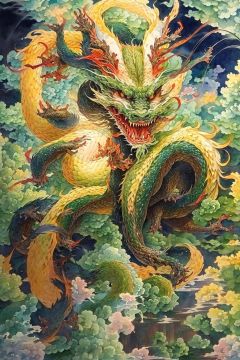 a chinese dragon shuttles through the clouds,the background is a sea of clouds in the air,a fierce expression,looking_at_viewer,upper_body,SOLO,fractal art background,幻想艺术,<lora:watercolour 13:0.6>,watercolour,<lora:东方巨龙Oriental giant dragon_1.0:0.8>,
