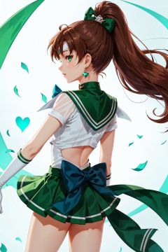 msn, 1girl, sailor jupiter, kino makoto, solo, sailor senshi uniform, bow, skirt, green skirt, green sailor collar, green eyes, pink bow, gloves, sailor collar, green choker, magical girl, choker, brown hair, jewelry, white gloves, ponytail, back bow, elbow gloves, tiara, brooch, green footwear, pleated skirt, hair ornament, hair bobbles, earrings, heart brooch, high ponytail