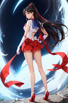 msn, 1girl, hino rei, sailor mars, solo, long hair, sailor senshi uniform, gloves, skirt, red skirt, red sailor collar, black hair, magical girl, back bow, sailor collar, bare legs, white gloves, high heels, jewelry, bow, elbow gloves, choker, earrings, tiara, very long hair, full body, purple eyes, pleated skirt, hand on hip, red footwear, shoes