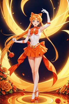 msn, 1girl, long hair, sailor venus, solo, blonde hair, sailor senshi uniform, skirt, aino minako, gloves, bow, orange skirt, magical girl, elbow gloves, red bow, hair bow, white gloves, orange sailor collar, very long hair, choker, blue eyes, orange footwear, standing, flower, full body, orange choker, arm up, rose, sailor collar, high heels, blue bow, jewelry, floral background, pleated skirt, back bow, tiara, looking at viewer, miniskirt