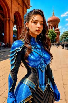 <lora:NeWHaDeSaRMoR_v2-000003:1> chndsrmr, beautiful girl in Bright Blue nhdsrmr, drill hair dark brown hair, making eye contact, Train Stations background