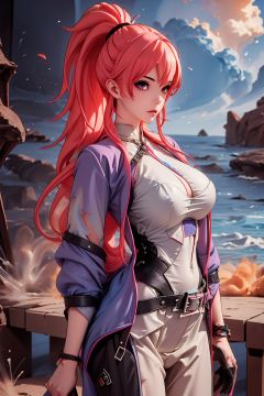 1girl, solo, breasts, purple eyes, long hair, jacket, looking at viewer, gloves, red hair, black gloves, blue jacket, ponytail, bangs, single glove, bodysuit, closed mouth, hair between eyes, open clothes, belt, standing, cowboy shot,fulijiaXF,