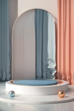 masterpiece,best quality,c4dzhantai\(zhantai\),Round column table in the water,blue sky,in the interior,there are gift boxes,water reflections,plants,curtains,spheres,c4d,OC renderer,Redshift renderer,3D texture,strong contrast,bright colors,studio lighting,high resolution,high quality,8K,<lora:c4dzhantai-000006:0.8>,