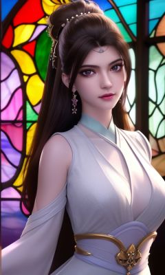 (,1girl, ,best quality, )<lora:336-DA-仙武传-楚萱儿:0.7>,, (close-up portrait),(upper body:1.22),(realistic:1.11),(Photo-referencing),HDR,Studio Lighting,Soft Lighting, (symmetric beautiful detailed eyes),Sparkling eyes,red eye shadow,(long eyelashes), a slender petite little girl,Delicate muscle lines,(Skinny body),(solo:1.5),( looking at viewer:1.22),The white shiny skin, (smirk:1.2),(dynamic pose),(arms behind back),arms at sides, (very long payot),(Absurdly long Brown straight hair:1.22),parted bangs, (floating hair), (jewelry:1.17), necklace, earrings,(colorful:1.27),(stained glass background),(dress:1.17),,