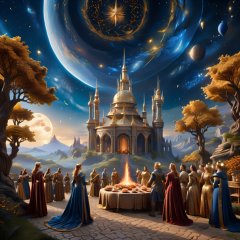 In the Sci-Fi Renaissance Fantasy realm of Eldoria, a tapestry unfolds, portraying a majestic courtly feast under a sky ablaze with magical constellations, woven in threads of celestial blue and golden hues.,Renaissance Sci-Fi Fantasy