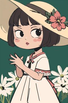 dmstyle,1girl, solo, dress, hat, flower, white dress, outdoors, pink flower, blurry, short hair, black hair, standing, sun hat, brown eyes, looking at viewer, lips, white headwear, parted lips, hand up, blurry background, tystyle
