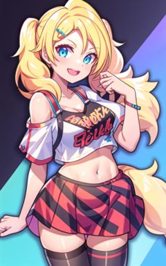 <lora:add_detail:0.5>,<lora:Kirara-mul-000008:0.8>,cowboy shot,Kirara_original,1girl,blonde hair,solo,navel,blue eyes,twintails,open mouth,midriff,thighhighs,crop top,smile,looking at viewer,black thighhighs,(white shirt:1.2),clothes around waist,off-shoulder shirt,short sleeves,bra strap,red checkered skirt,