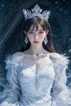 upper_body,(RAWphoto:1.2),(photorealistic:1.4),(masterpiece:1.4),(bestquality:1.4),HDR,1girl,earrings,jewelry,ice and snow crown,solo,exquisite eyes,gradient_background,bangs,dress,shiny skin,conforming to common sense,(half body:1.2),perfect figure,snow world,sitting on the throne,long leg,<lora:ice cake_20231126200433-000018:0.7>,