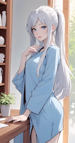 (monochrome:1.2), highly detailed, best quality, illustration, highres, extremely detailed wallpaper,sketch, flat color, anime screencap, , realistic, a beautiful girl, blue eyes, white hair, bangs, head gear, necklace, tattoo, off shoulder, jacket removed, planted_sword, coffee shop, indoors, windows, book stack,cups, pencil, mirror, plant, leaves, flowers, nature, wind, outdoors, reflection, depth of field, delicate foreground, extremely delicate background,