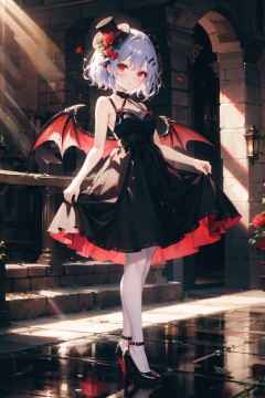 masterpiece,best quality,(ray tracing, reflection light),sunlight,(Light shines on the characters)1girl, wings, bat_wings, remilia_scarlet, demon_wings, dress, solo, hat, white_legwear, red_rose, top_hat, pantyhose, rose, high_heels, depth_of_field, hair_ornament, red_flower, mini_hat, black_dress, bare_shoulders, red_eyes, flower, mini_top_hat, alternate_costume, bare_arms, standing, black_footwear, tilted_headwear, skirt_hold, Castle <lyco:GoodHands-beta2:1.0>