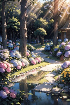 masterpiece,best quality,(ray tracing, reflection light, film grain), sunlight, daisy, flower, grass, white_flower, blue_flower, bush, tree, nature, forest, hydrangea, garden, purple_flower, lily_\(flower\), yellow_flower, no_humans, outdoors, dandelion, plant, field, on_grass, tree_stump, pink_flower, foliage, flower_field, day, watering_can, path, orange_flower, tree_shade, sunlight, sunbeam