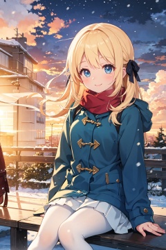 masterpiece,best quality,(ray tracing,cinematic lighting)(straight-on),(upper body),cowboy shot,1girl,solo,blonde_hair,Long hair,Big hair,(cloud:1.7),extremely detailed CG unity 8k wallpaper,illustration,lens 135mm,masterpiece, best quality,Light smile,naughty face,(white pantyhose:1.2),scarf,in winter,snowflakes,(snowing day),(city),(street),duffel coat,winter coat,pleated skirt,Blush,blue eyes,aquagradient eyes,Light smile,Sitting,bench,(Hair bow),Hair ribbon,(sunset:1.3),(golden hour lighting:1.3),