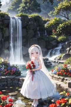 masterpiece,best quality,(ray tracing,cinematic lighting),sunlight, 1girl, (loli),(child),bare shoulders, white hair, veil, blue eyes, very long hair, (:3 ), bouquet, day, dress, flower, holding, holding bouquet, lake, looking at viewer, nature, outdoors, red flower, rose, solo, standing, tree, water, water drop, waterfall, wetsky, cloudy sky, building,