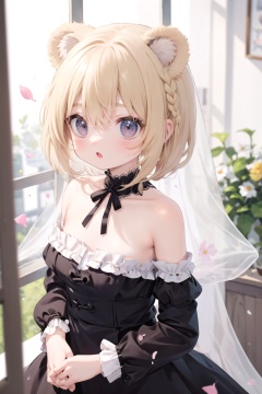 loli, (out the window:1.2), (outside view:1.2), From the third person, fluttering petals, (depth of field, blurry, blurry background, bokeh:1.2), close-up, very long hair, upper body, light blonde hair, bear ears, shamed, expressionless, frills, veil, see-through, :o, dress, flower patterned dress, messy hair, braid, gothic lolita, lolita fashion, bare shoulders, masterpiece