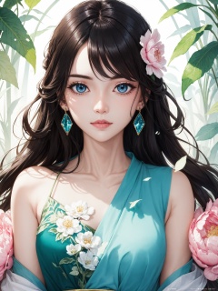 Light green peony flowers,  exquisite composition,  clear focus,  delicate light and shadow,  Studio Ghibli style green flame,  ancient clothing,  Tang Dynasty clothing,  red peony flowers,  highest picture quality,  masterpiece,  exquisite CG,  crystal,  peony flower personification,  exquisite and beautiful face,  cold expression,  noble and elegant,  beautiful eyes,  watercolor,  splashing ink,  blue crystal eyes,  long hair,  ancient coiled hair,  black hair,  exquisite and complex peony hair accessories,  Broken glass,  crystal minerals,  colorful peonies,  colorful petals,  highlights,  withering and falling petals,  the picture is rich and beautiful,  charming,  perfect,  dreamy decoration,  deep in the jungle,  ultra clear,  high-definition,  8k,  peony girl,  solo,  detailed lightning,  detailed lightning,  splashing ink,  crystal clear. Using 2.2D illustration