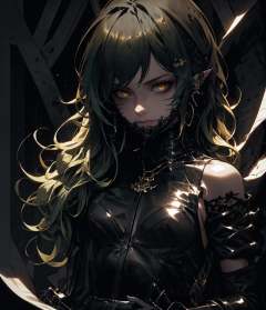 dark theme, gavial, green hair, yellow eyes, eyeliner, bare shoulders, upper body, necklace, looking at viewer, solo, <lora:Gavial-04:1>, <lora:LowRA:0.8>, <lora:jaw_hood_tooth-08:1>, (Random:1.3), (wavy hair:1.3), (leather corset, lace mini skirt, and thigh-high boots:1.1)