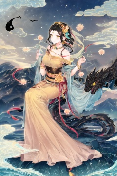 <lora:gilding_v1-000006:0.8>,1girl,black dragon,black hair,bracelet,cloud,full body,gilding\\(style\\),long skirt,lotus,mountain,shawl,solo,waves,yellow eyes,