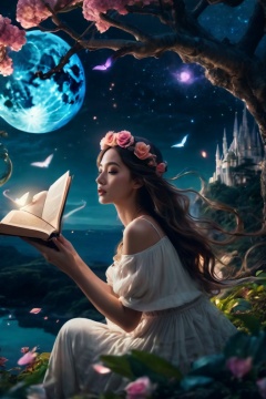 (high quality:1.4), (best quality:1.4), (masterpiece:1.4), official art, official wallpaper, surreal, beautifulgoddess, (1woman:1.1), (long wavy hair:1.1), (flower crown:1.1), (mystical creatures:1.1), (floating islands:1.1), (detailed landscape:1.1), (magic in the air:1.1), (stardust:1.1), night sky, (whimsical atmosphere:1.1), (dreamlike world:1.1), (bubbles:1.1), flying books, (luna moths:1.1), (moonlight:1.1), enchanted forest, (wisdom:1.1), (powerful energy:1.1), (guardian angels:1.1), (peaceful:1.1), vibrant colors, (detailed:1.05), (extremely detailed:1.06), sharp focus, (intricate:1.03), cinematic lighting, (extremely intricate:1.04), (epic scenery:1.09), vibrant colors, (beautiful scenery:1.08), (detailed scenery:1.08), (intricate scenery:1.07), (wonderful scenery:1.05),, (sharp focus,absurdres,high quality,masterpiece,highres,best quality:1.5)