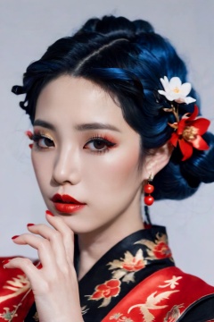 1girl,solo,hair ornament,flower,hair flower,makeup,blue hair,eyelashes,dacing,white background,black hair,eyeshadow,lips,profile,parted lips,chinese clothes,red lips,bare shoulders,upper body,lipstick,simple background,solid-best-physical-appearance-perfect::2,perfect hands,