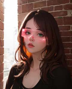 1girl, cyber_glasses, glowing, upper body, <lora:cyber_glasses-07:0.65>, dark lighting, (dithering:1.3), (Random:1.3), layered hair, chestnut hair, prominent eye shape, green eyes, medium breasts, korean girl look, modern loft apartment with exposed brick, (masterpiece, best quality, absurdres, detailed, ultra-detailed:1.3), attractive, (ultra realistic, sharp focus:1.3)
