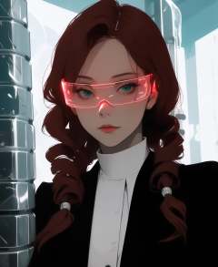 1girl, looking at viewer, cyber_glasses, glowing, upper body, <lora:cyber_glasses-07:0.8>, natural lighting, (scanlines:1.3), (Random:1.3), drill hair, dark red hair, round eye shape, green eyes, medium breasts, business outfit, glistening ice cave with icicles, alluring