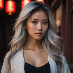 (colorful), (powerful colors:1.4), photographic of a (beautiful chinese girl:1.3), (tan skin), fashionable, light dust, varied depth of field, medium hair, long hair, white hair, tone mapping, hyper focus, red, glowing eyes, (upper body:0.8), natural body, limited palette, (detailed hair:1.13), (white outlines), (creative background), (creative), hard lighting, solo, clarity, (by Giovanni Battista Caccioli:1.6), (accomplished:0.8)