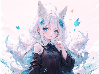 (Masterpiece:1.2, high quality),1girl,smile,:p,blue_eyes,bow,very_long_hair,upper_body, beautiful detailed eyes, fox_ears, fox girl, fox tail,mouth_open,head tilt, hand_to_mouth, ahoge, hair between eyes, hair ornament, bare_shoulders, detached_sleeves,