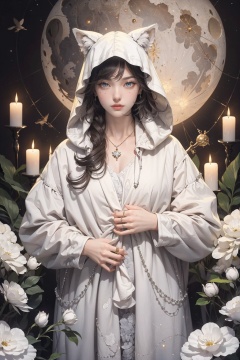 Masterpiece, illustration, 8K wallpaper, super detailed, upper body, 1 girl, white field, holding a flower (surrounded by 3 wolves: 1.2), animal, skull, flower, solo, gray eyes, looking at the audience, white hair, white flowers, white grass, parted lips, dress, jewelry, moon, ring, long hair, bangs, long sleeves, necklace, new moon, glowing, white hooded robe, standing, hair accessories, planet, The hair between the eyes,