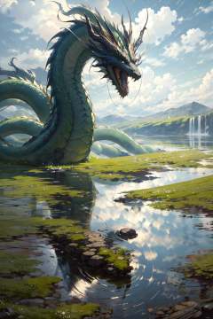 (masterpiece:1.2),best quality,PIXIV,Chinese dragon,cloud,outdoors,water,sky,cloudy sky,scenery,dragon,reflection,eastern dragon,grass,day,oversized animal,fantasy,<lora:Chinese dragon-000014:1>,