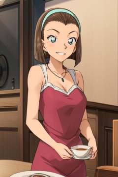 sonoko,1girl,solo,blue eyes,hairband,brown hair,short hair,cleavage, medium breasts,sleeveless dress,earrings, indoors, banquet,desk, smile, necklace, table, teacup,  <lora:sonoko:0.8>