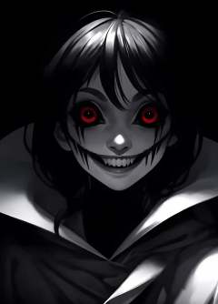 dark theme, horror theme, creepy_pasta, monochrome, greyscale, 1girl, crazy eyes, teeth, grin, looking at viewer, <lora:creepy_pasta-10:1>, <lora:LowRA:0.8>