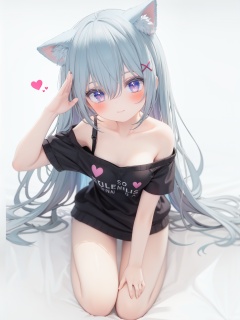petite, loli, solo, animal ears, heart, puffy short sleeves, blue hair, long hair, off shoulder, bangs, hair ornament, gradient background,rainbow gradient, x hair ornament, animal ear fluff, looking at viewer, very long hair, blush, smile, cat ears, bare shoulders, collarbone, hand up, gradient sweater, hair between eyes, symbol-shaped pupils, arm up, heart-shaped pupils, hairclip, medium breasts, salute, bare legs,full body