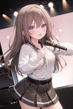 1girl, solo, microphone, smile, skirt, blush, brown eyes, long hair, open mouth, looking at viewer, brown hair, long sleeves, :d, shirt, bangs, belt, breasts, pink shirt, outstretched arm, music, black belt, medium breasts, holding microphone, singing