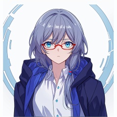 (masterpiece:1.3),(the best quality:1.2),(super fine illustrations:1.2),(Masterpiece),high quality,high detail,(white background:1.2),looking at viewer,(SOLO:1.4),outline,simplebackground,, long hair,red-framed eyewear,blue eyes,bangs,hair ornament,long sleeves,blue jacket,hair between eyes,fu hua,thighhighs,messy hair,hooded jacket,hood down,side ponytail,hood,collarbone,white shirt,coat,barefoot,puffy sleeves,low ponytail,grey hair,