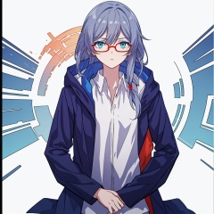 (masterpiece:1.3),(the best quality:1.2),(super fine illustrations:1.2),(Masterpiece),high quality,high detail,(white background:1.2),looking at viewer,(SOLO:1.4),outline,simplebackground,, long hair,red-framed eyewear,blue eyes,bangs,hair ornament,long sleeves,blue jacket,hair between eyes,fu hua,thighhighs,messy hair,hooded jacket,hood down,side ponytail,hood,collarbone,white shirt,coat,barefoot,puffy sleeves,low ponytail,grey hair,