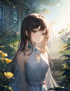 (masterpiece, best quality,top quality),1girl,looking_at_viewer,white dress,plant,chinese,Tindal effect,particle effects,impressionist art,portrait,reflective,