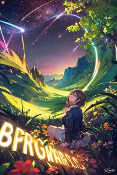 (ray tracing),(glowing light),(signature),(English text:1.5),(Star Trails),wide shot , (depth of field,panaroma,distant view),global illumination,soft shadows,grand scene,backlight , lens flare , ((colorful refraction)) , ((cinematic lighting)) on the grass,sitting,flowers, 1girl with brown hair ,yellow eyes, sunlight, very beautiful sky