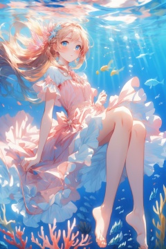 best quality,(masterpiece:1.3),ultra-detailed,best quality,(masterpiece:1.3),long shot,frill,golden hair,long hair,pink dress,blue eyes,floating in water,jump up,delicate_features,pretty_face,pure,lovely,blush,looking at viewer,bare foot,seabed,under the sea,underwater,deep sea,<lora:menghuangan_max:0.7>,<lora:fanguang_V1-000014:0.5>,<lora:add_detail:0.5>,