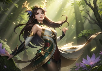 masterpiece, best quality,top quality,(wide shot:0.95),Dynamic angle,1 girl,solo,antlers,league of legends,looking at viewer,brown hair,long hair,green theme,flower,(forest in background:1.2),sunshine,depth_of_field,particle effects,<lora:【moba】lol淘宝款:0.8>,