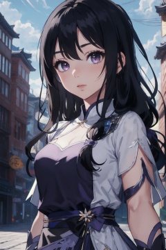 masterpiece,best quality,extremely detailed 8K wallpaper,1girl,lingyueru,black hair,long hair,purple dress,looking at viewer,upper body,