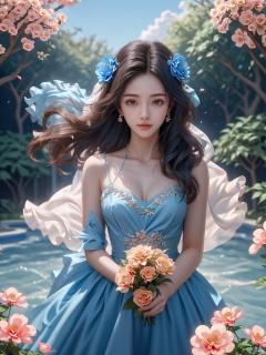 (Good structure),HDR,UHD,8K,A real person,Highly detailed,best quality,masterpiece,1girl,realistic,Highly detailed,(EOS R8, 50mm, F1.2, 8K, RAW photo:1.2),ultra realistic 8k,(best illumination, best shadow, extremely delicate and beautiful),(official art, beautiful and aesthetic:1.2),solo,1girl,long hair,Wind,flowing hair,kind smile,pose for picture,looking_at_viewer,perfect body,wedding dress,(blue dress),(blue theme),jewelry,Garden background,(Floating flower),flowers,liuyifei,dachangtui,HUBG_CN_illustration,crystal,,,