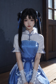masterpiece,best quality,extremely detailed 8K wallpaper,1girl,zhaolinger,blue and white dress,twintails,bangs,black hair,