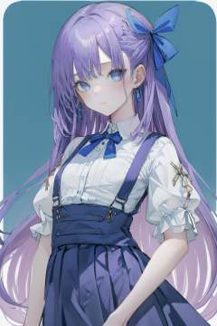 -siki, 1girl, purple hair, long hair, meltryllis \(fate\), blue eyes, breasts, solo, shirt, small breasts, ribbon, bangs, white shirt, looking at viewer, jewelry, blue ribbon, suspenders, hair ribbon, very long hair, earrings, high-waist skirt, skirt, collared shirt, suspender skirt, short sleeves, blue skirt, blush, dress shirt, puffy sleeves<lora:siki-000018:0.8>,