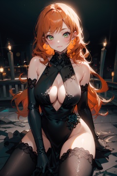 masterpiece,best quality,cowboy shot,looking at viewer,1girl,solo,orange hair,green eyes,:3,large breasts,collarbone,black evening gown,elbow gloves,black gloves,black thighhighs,kneeling