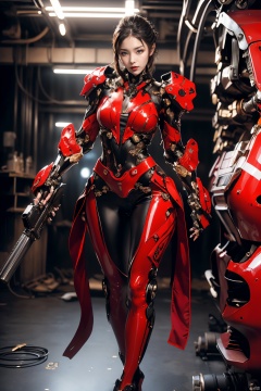 (Masterpiece: 1.6, (highly detailed: 1.6), (best quality: 1.6) (high resolution: 1.6) 1 girl, red patent leather Skin-tight garment, (mechanical: 1.1), complex decoration, armed weapons, Futurism, punk,machinery,blue_jijiaS,Sexy muscular, Hyung Tae Kim, mecha, circular face