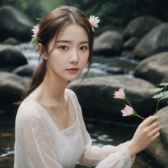 (extremely detailed CG unity 8k wallpaper),(((masterpiece))), (((best quality))), ((ultra-detailed)), (best illustration),(best shadow), ((an extremely delicate and beautiful)),dynamic angle,floating, solo,((1girl)),{long wavy curly hair},expressionless,((white idol dress)), anglesailor dress,(detailed wet clothes),silk shawl,bikini,underboob, frills,cute anime face,blush,(beautiful detailed eyes), (detailed light),feather, nature, (sunlight), river, (forest),(((floating palace))),beautiful and delicate water,(painting),(sketch),(bloom),(shine),