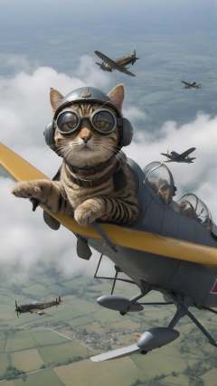 Human-sized cats in pilot uniforms of the Royal Air Force and Luftwaffe flying planes, engaged in an aerial dogfight. The planes are scaled to fit the cats. The lead cat, wearing a pilot's helmet and goggles, shows a focused expression.