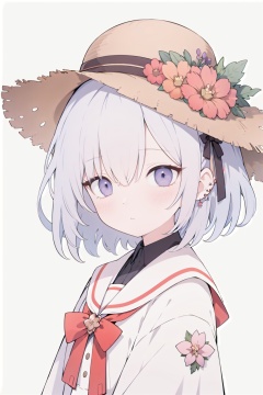 Straw hat,quality_best,style_onineko,(Distinct pupils)(Clear eyes),1girl,solo,c,earrings,looking at viewer,flower,short hair,bangs,closed mouth,simple background,black headwear,white background,red flower,upper body,white hair,hair intakes,frills,purple eyes,hair ornament,expressionless,hat flower,eyelashes,best quality,