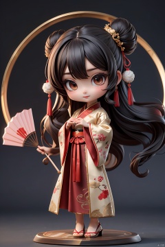 Best quality, masterpiece, 1 girl, chibi, wearing hanfu, [Chinese Valentine's Day theme],low saturation theme, looking at viewer,embroidered robe with exquisite details, gentle and demure disposition, elegant and graceful movements, silk slippers with golden embroidery,Arch bridge, slustrous black hair styled in a neat bun, graceful and precise hand movements, a humble and obedient demeanor, surrounded by the fragrance of flowers and the sound of flowing water,Handheld fan,fan,Chinese fan