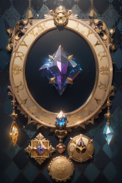 masterpiece,best quality,no humans,gold line,gold,argyle,argyle background,gem,glowing,gold trim,jewelry,magic circle,symbol,crystal,fantasy,still life,badge,